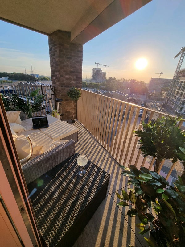 This stunning two-bedroom, two-bathroom apartment features a spacious private balcony with a comfortable outdoor sofa, perfect for relaxing and enjoying sunny summer days.