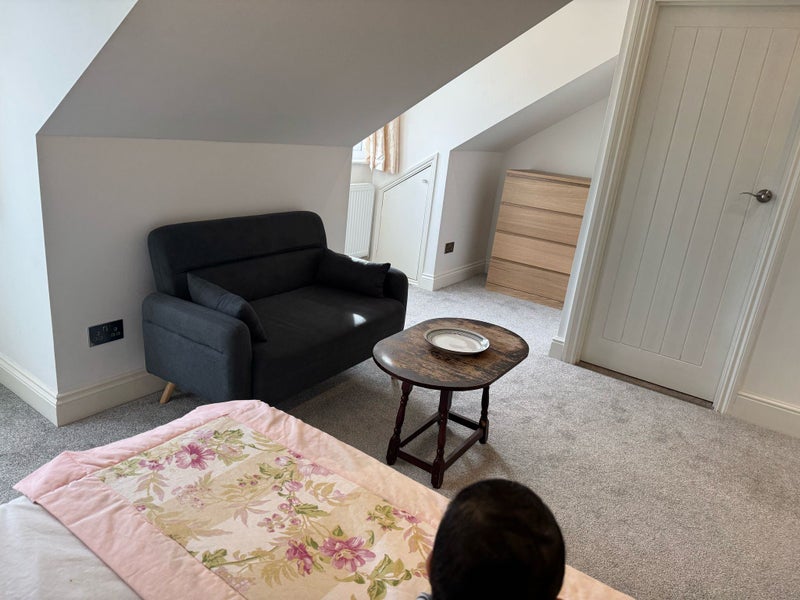 This well insulated cozy room has 3 central heating comes fully furnished with new bed, drawers and mattress, small living space with sofa and tea table.