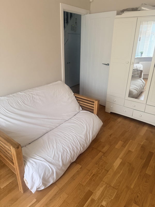 Furnished - solid oak double bed/sofa (futon company), room storage. and fridge freezer.
