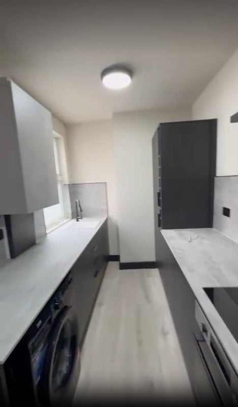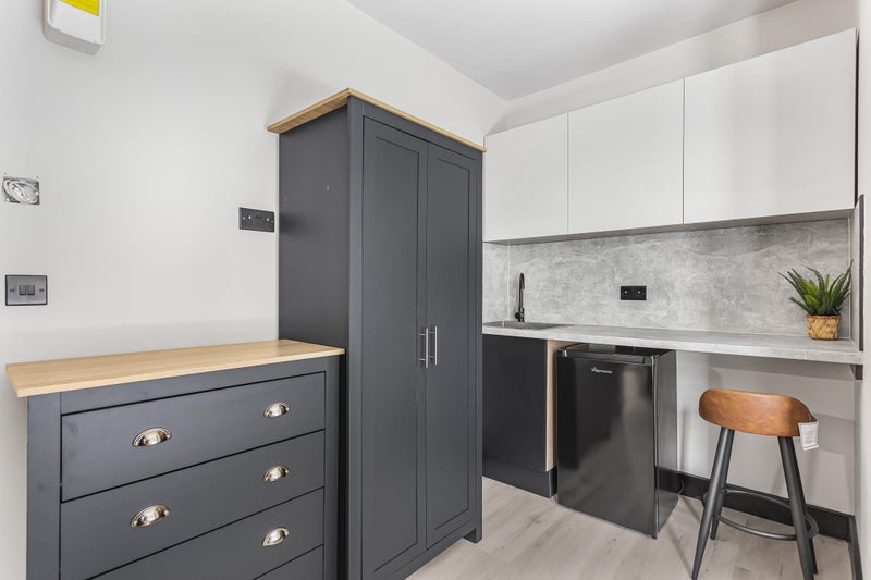 The communal kitchen is fully furnished with a washing machine, tumble dryer, pots, pans etc.