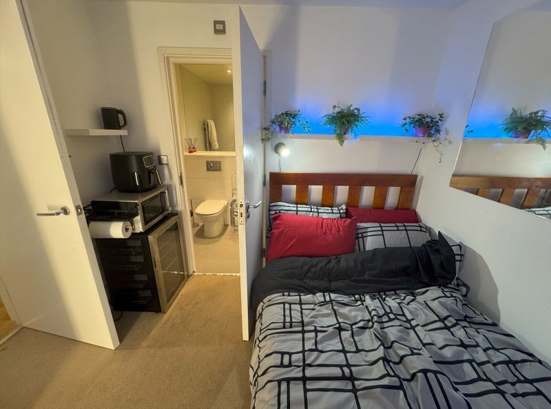 - Double bed with new bedding and memory foam mattress