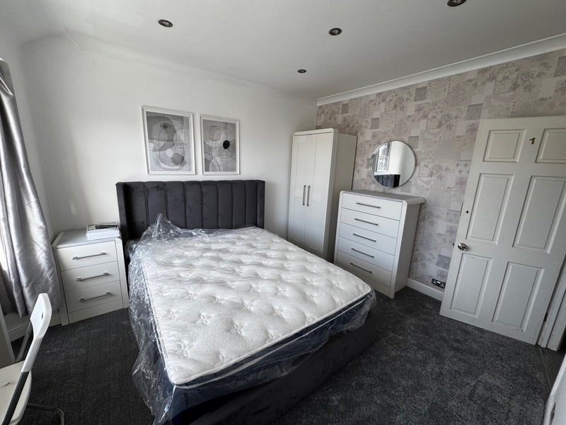 This is for a furnished double room with a king size bed and en-suite. 1gb fibre broadband, 42”TV, close to shops train station and leisure centres. The double room available in a lovely newly renovated serviced accommodation. Suitable for working professionals.