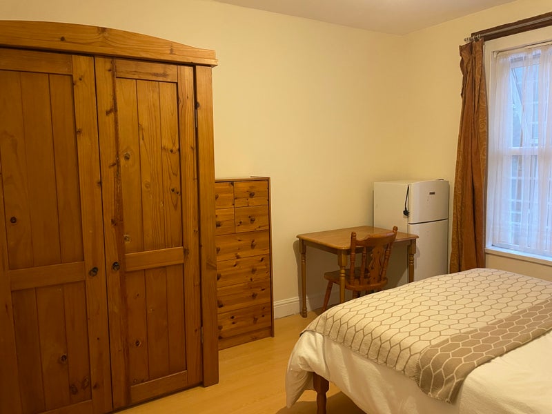 Double room with laminated flooring, bed, wardrobe and shared bath and kitchen. Own fridge.