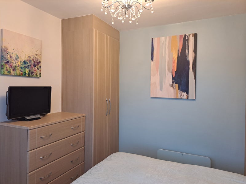 The lardge bathroom with shower/bath washbasin and toilet is on the same floor as this bedroom. I have my own en suite so i don't need to use it. There is also the benefit of a WC on the ground floor near to the fitted kitchen. There is also a dining area for your use. I have 2 very friendly cats but they stay in the lower part of the 3 storey house and in the garden.