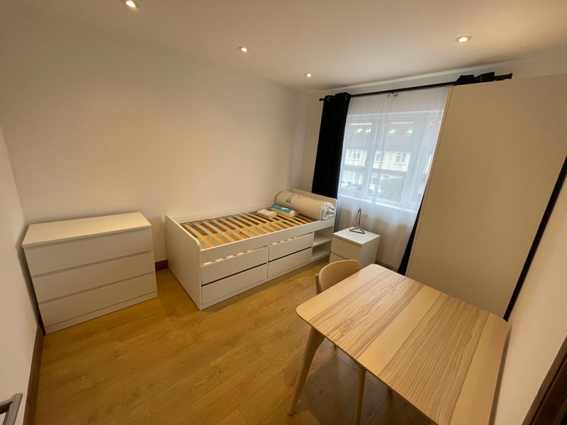 Fully furnished with single bed & mattress, wardrobe, chest of drawers, desk, chair, bedside table.