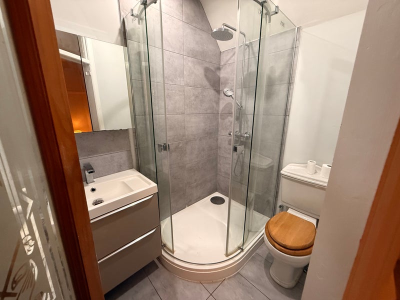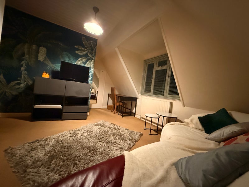 Light Large Double Room at the top of a big old house with windows looking into tree canopy with modern en-suite and decent size shared lounge area. Shared access to fully equipped kitchen and access to shared garden. Space for a bicycle in shared entrance hall. Looking for someone who is clean and tidy and easy going.