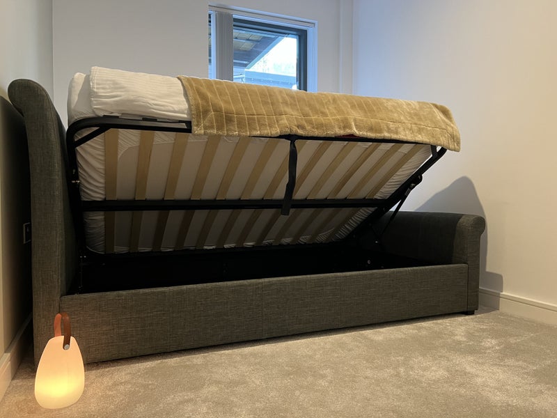 The room has a corner wardrobe and an ottoman style storage bed with additional storage in the hallway if needed.