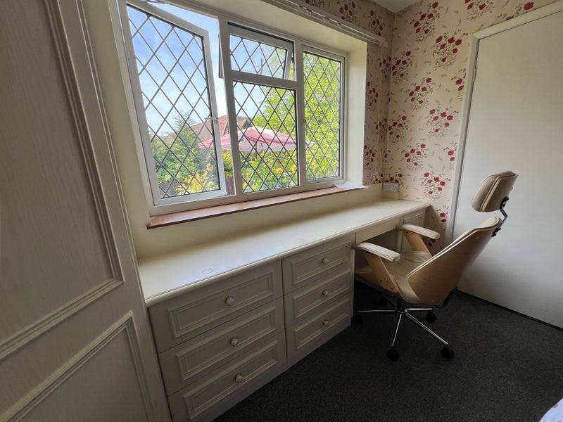 The room benefits from large built-in wardrobes, multiple drawers, and plenty of storage space, making it ideal for professionals or students. A dedicated desk area is also included, perfect for working from home.
