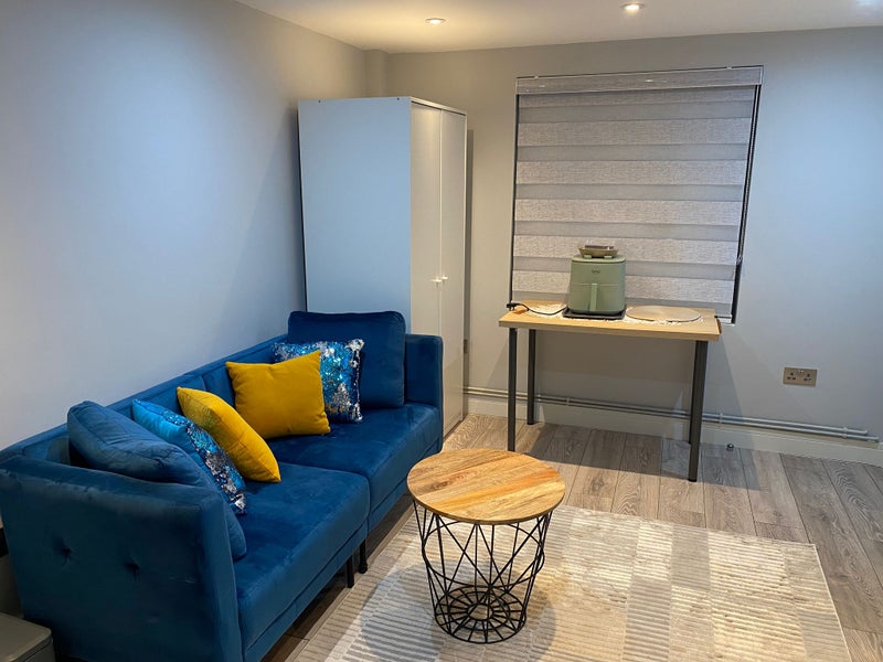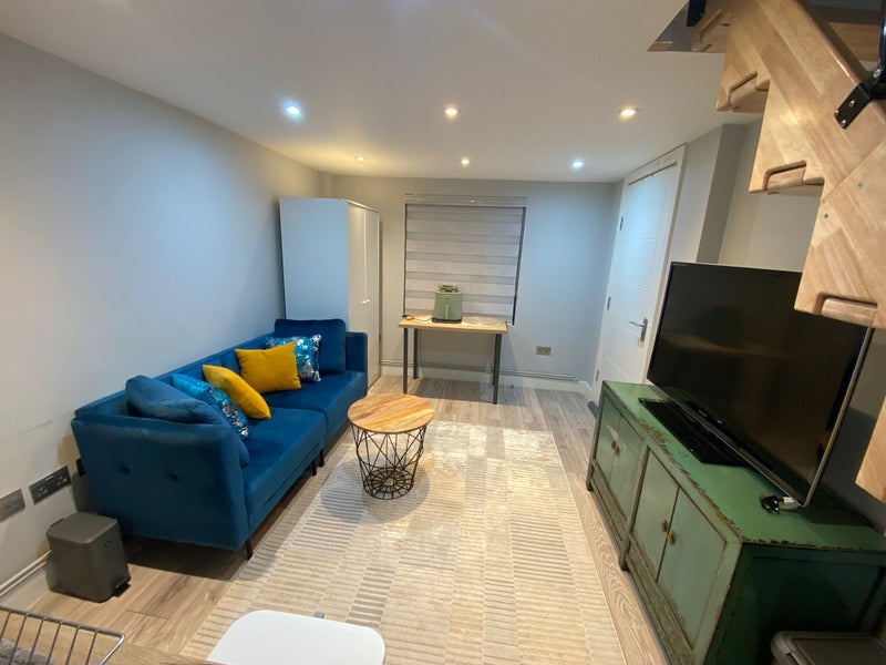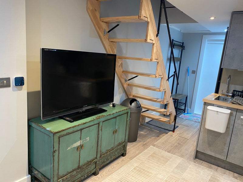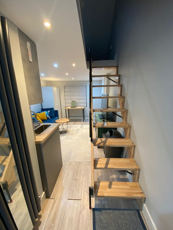 A cosy self-contained studio available. The ground floor includes the living area and kitchen, and there is an upstairs mezzanine level with a comfortable bed and workspace.