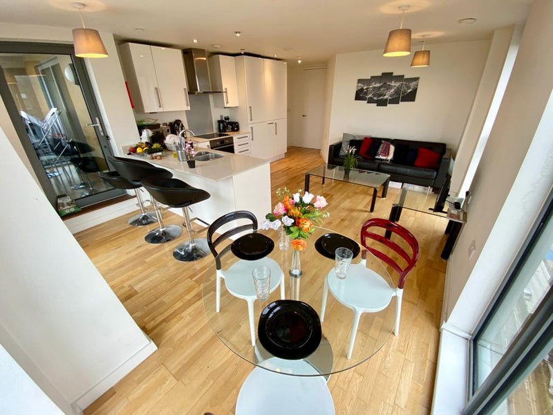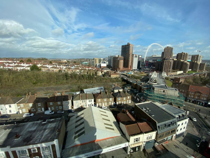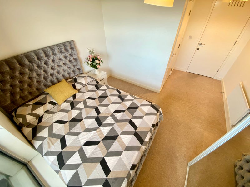Stylish and spacious ensuite double room available in a modern, well-maintained flat in HA9. The room features a comfortable double bed, large wardrobe, bedside table, and plenty of natural light through floor-to-ceiling windows with access to a private balcony area.