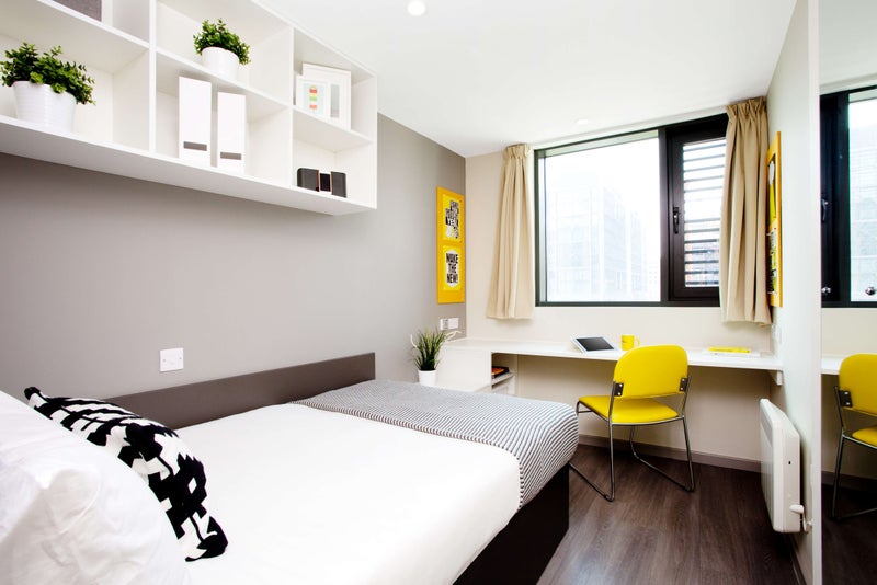 It’s an en-suite room, which has a private shower room with sink and toilet, a comfortable bed and a Wi-Fi connected study area. As well as a wardrobe, you'll find storage space under your bed and shelves and drawers to store your belongings. There is a shared fitted kitchen with a living area is an ideal space to relax with flatmates.