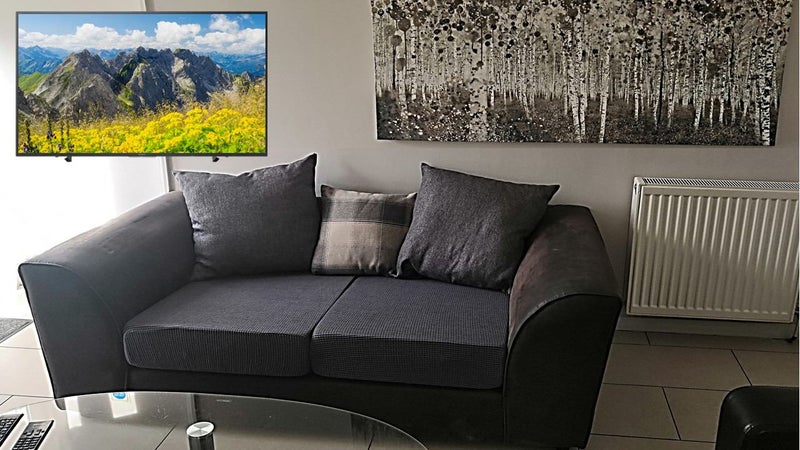 * A shared open plan area with attractive tiled floor, two sofas, armchair, Sony 43" Freeview HD Smart TV and Sony Blu-Ray player.