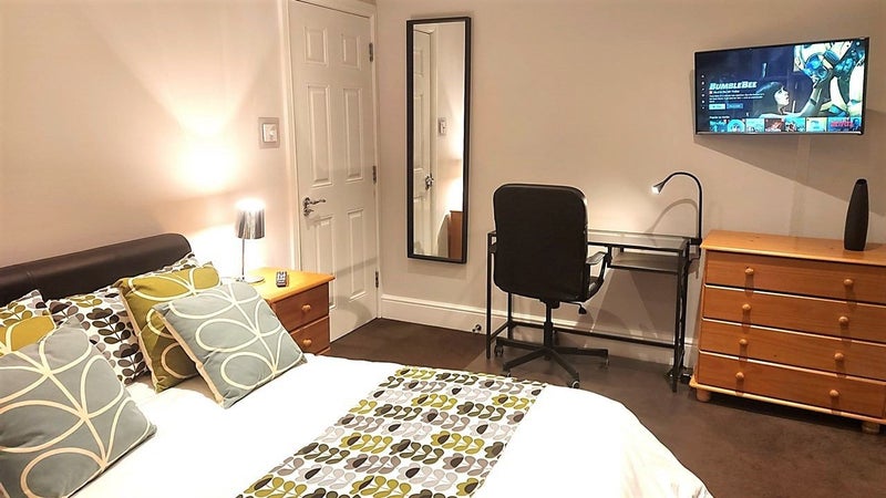 * Fully carpeted and furnished including double bed, wardrobe, chest of drawers, bedside drawers, desk, chair and a wall-mounted Smart TV.