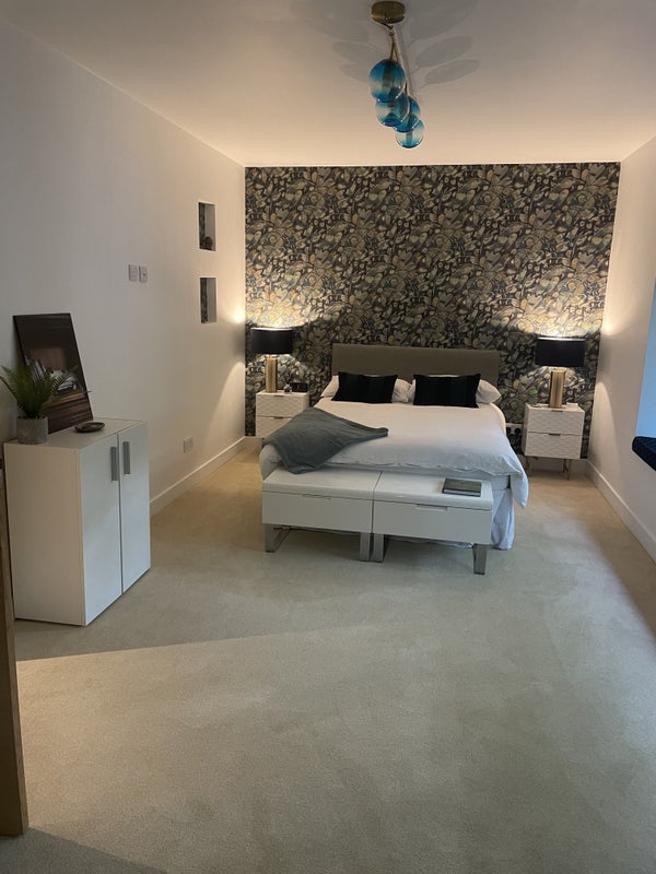The room is bright and airy, featuring a large double bed with built-in storage, stylish furnishings, and extensive wardrobe space running along the entire back wall (not shown in photos). It’s a generous, well-designed space with plenty of storage.