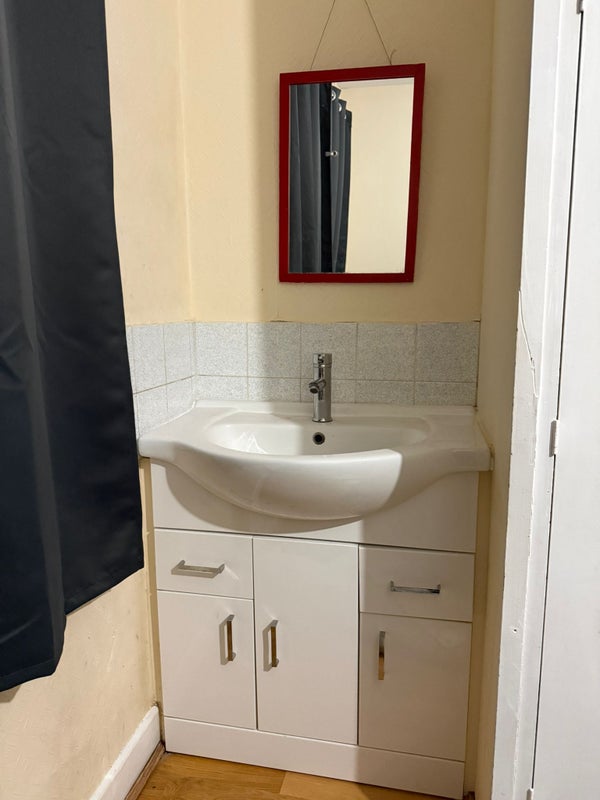 This is a semi-ensuite room, which includes a private in-room vanity with sink, mirror, and vanity unit. The main bathroom is shared with only one other person, and there is also an additional downstairs WC. In total, there are three bathrooms in the property.