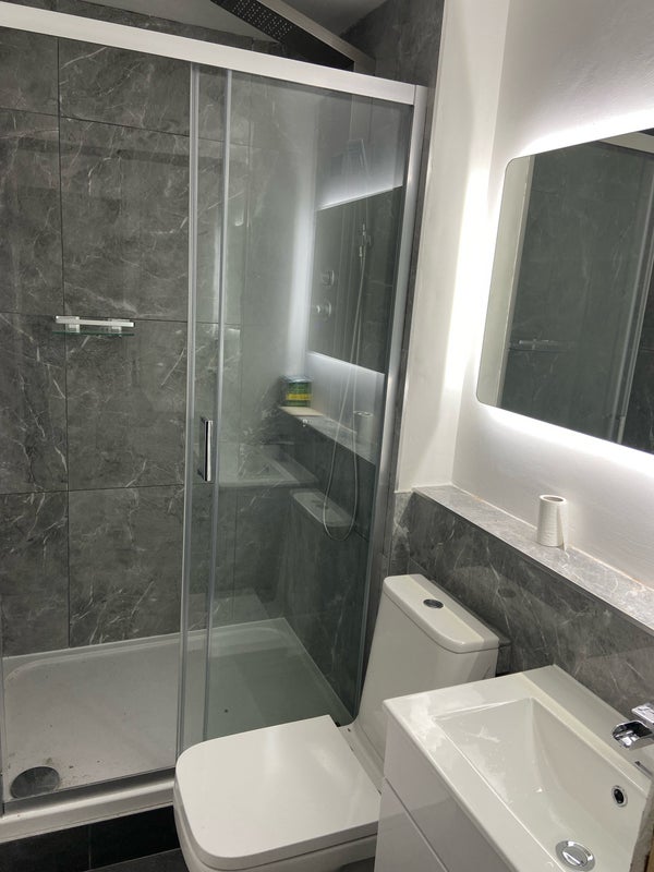 Kitchen and living room are upstairs on the first floor. We also have a small balcony with patio heaters for some much needed fresh air and a small outdoor space on the ground floor for sitting out. We also have a utility room next to the bedroom, equipped with a washing machine and brand new samsung tumbledryer as well as an extra fridge freezer.