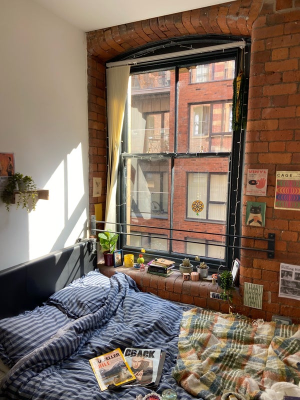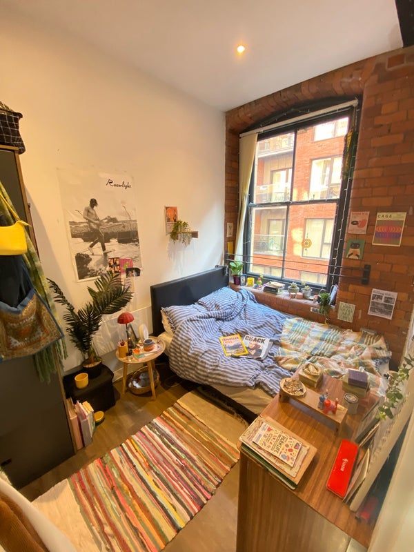 The flat & whole block has a charming, distinctive historic look. Room small but gorgeous high ceilings & great character, with exposed brick wall & beautiful large window letting in lots of light. 🌞 Double bed, comes with tall wardbrobe. Shared areas very spacious & also characterful.