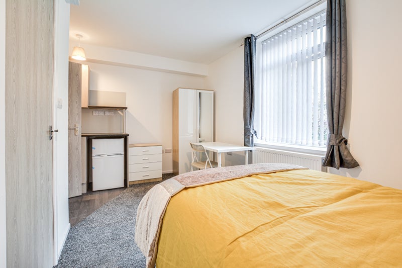 Double wardrobe, chest of drawers, bedside cabinet, table and chair, also includes your own fridge freezer.