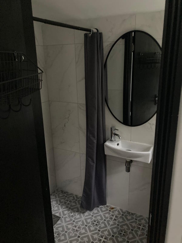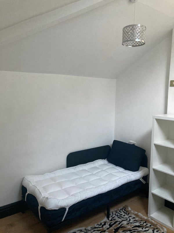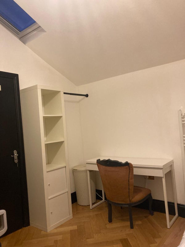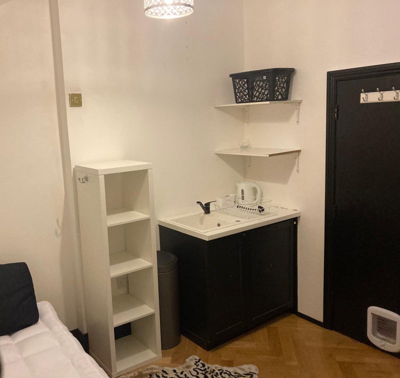 There is a small kitchen unit in the room including a sink, Kettle, Toaster, Microwave, plates and cutlery, and own Washing machine. Single bed, bedding can be provided, dressing table, mirror and chair, wardrobe, shelves. and hooks. Fridge/Freezer in the hallway.