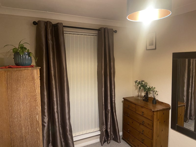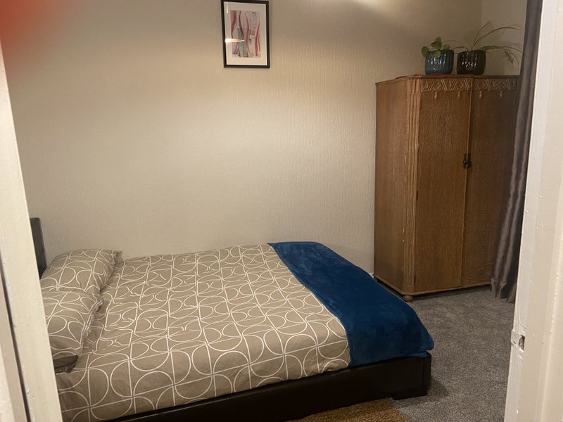 A lovely, decent sized double room in a friendly, homely flat with balcony. The room has been refurbished (incl new carpet). Furnished with: bed, vintage wardrobe and matching bedside cabinet, chest of drawers, shelves, mirror and large floor to ceiling window.