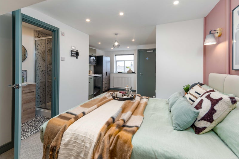 A bright, stylish space with a double bed, wardrobe, desk, and bedside table - everything you need to move straight in.