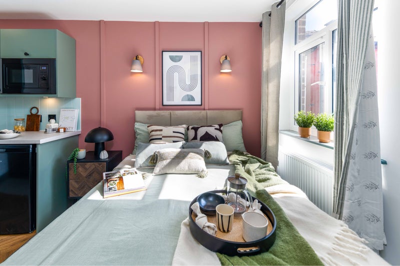 A bright, stylish studio-style space with a double bed, wardrobe, desk, and bedside table, offering extra room and flexibility for comfortable living.