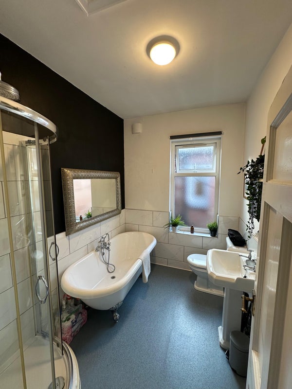 The house has 4 double ensuite rooms and a 2 room wing with its own bathroom. It is 2 min walk to Chorlton's bars and cafes, supermarkets, 2 blocks to the city centre bus, 5 mins to the metro, and there is street parking around the corner. It's opposite the school the Bee Gees attended and is in a quiet and well known road in Chorlton around the corner from the Tea Hive & Barbecue cafes.