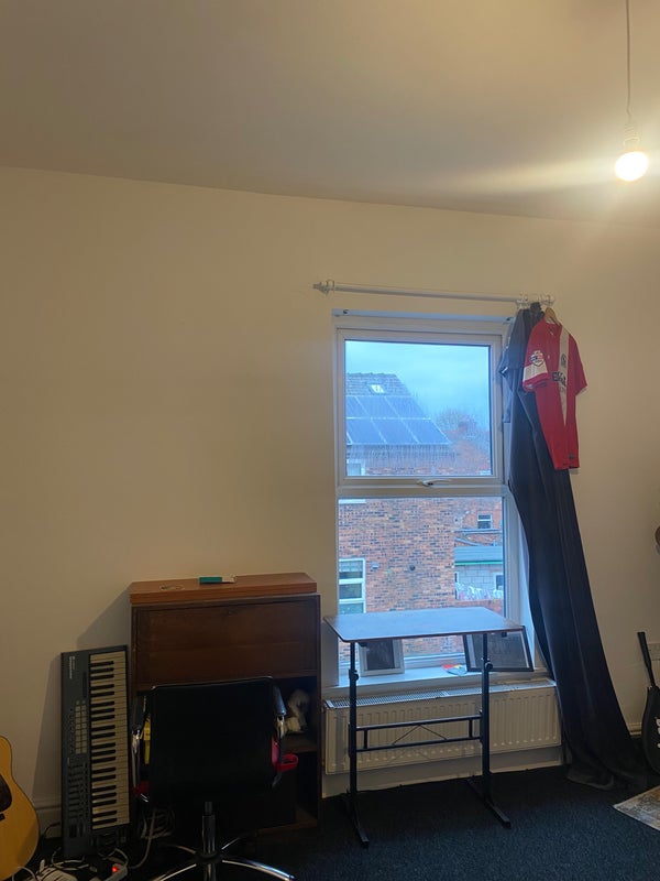The room does come unfurnished, but with a rail and some draws included. Bills and rent come to about 740 a month. 5 min walk to firswood tram stop, about 10 min walk into central chorlton