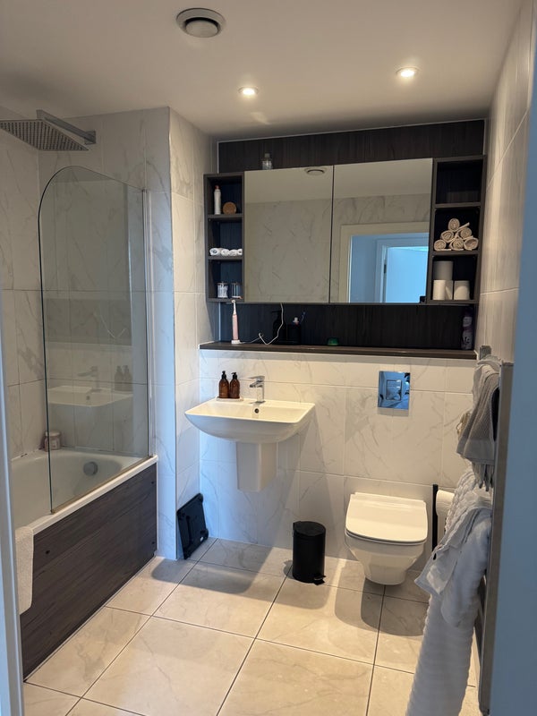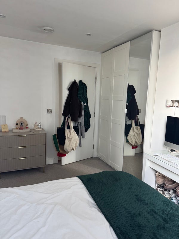 The flat has a big kitchen living room with an island and plenty of storage for the three of us. The bedroom is spacious with a big wardrobe and a double bed, and the bathroom is shared with one other girl, with storage cupboards and a bath.
