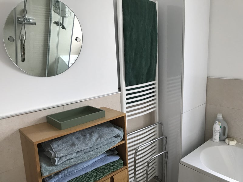 2) good bathroom with bath and separate shower. I’d provide the hand towels and bath mats, which I wash twice a week. I can lend you bath towels but they’d go in your laundry!
