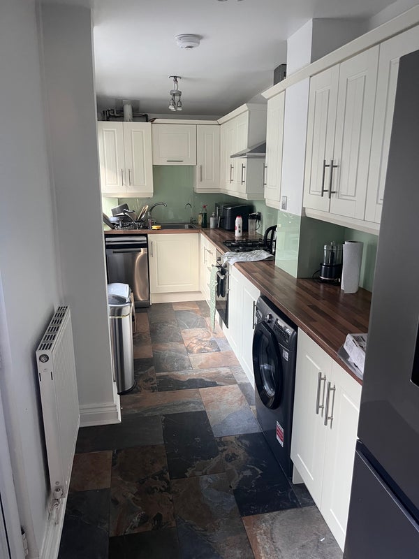 The living room / kitchen is shared, with plenty of space for all your stuff. The sofa is also new and really comfortable!
