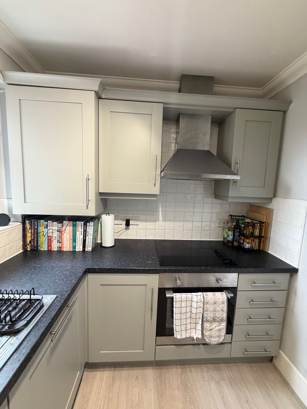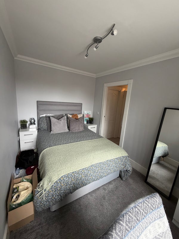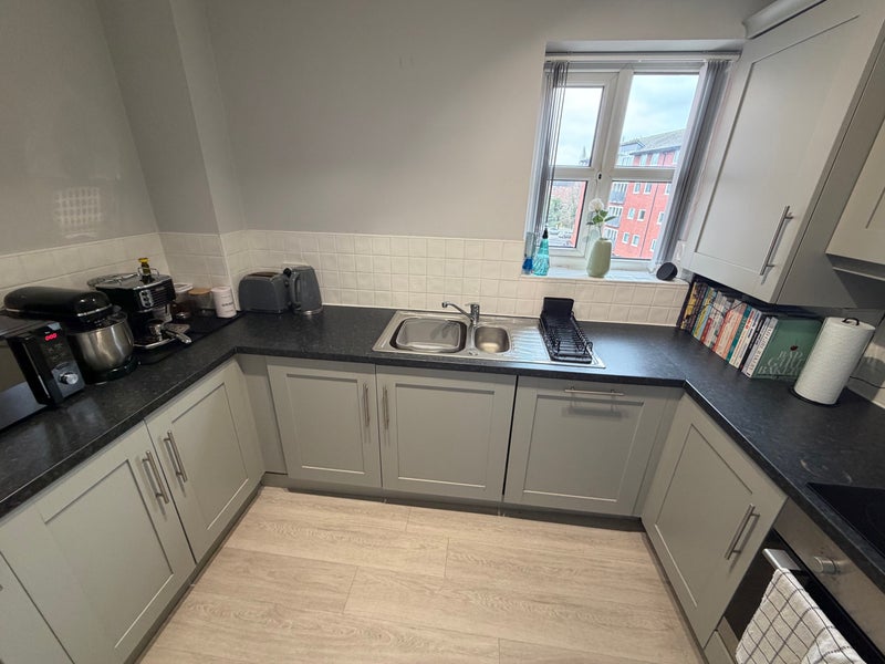 I have the bedroom with en-suite so the room available comes with sole access to the main bathroom as pictured. The bedroom comes with all furniture except the desk and mirror. There is also a chest of drawers which I currently have in my room but this would be returned, and there is storage under the bed too. The kitchen is separate to the living room/dining area and has lots of cupboard space. The living area is modern, spacious and bright with a Juliet balcony. There is also a storage cupboard with washer dryer.