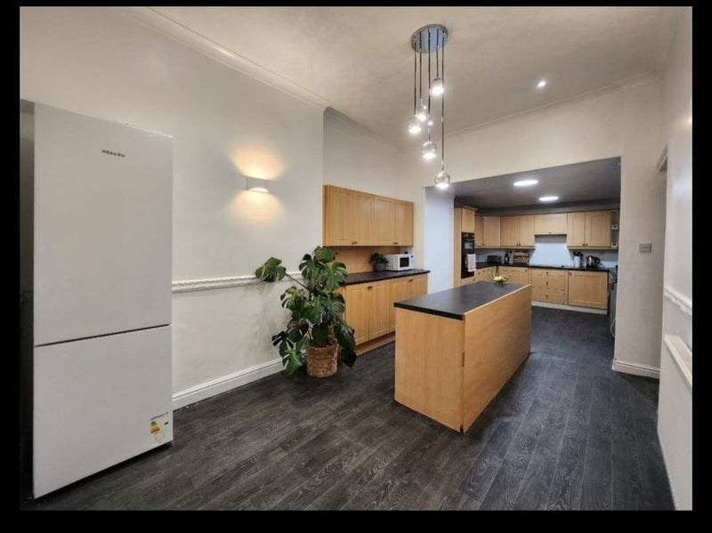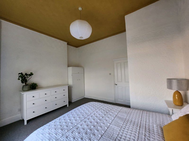 I have a beautiful room for let in this 5-bed property in Failsworth. This is a first floor room with high ceilings and beautiful original cornicing and architrave. It includes a king-sized bed, two nightstands & lamps, a wardrobe, a large Ikea Hemnes chest of drawers, a large desk, as well as curtains and pendant light. This room feels modern and relaxing.