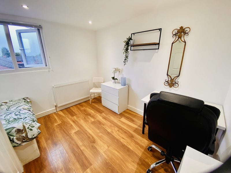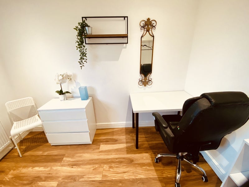 All rooms Fully furnished with new double beds, semi orthopaedic mattress, wardrobe/clothes rail, desk, chair and shelves, mirror, artwork, laminate flooring.