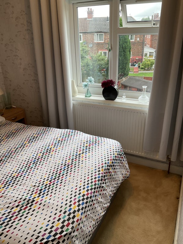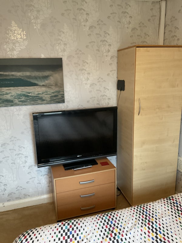 Single bedroom to let in three bedroom semi detached house the room consists ..double bed - wardrobe -set of drawers - bedside table with lamp - large television - room overlooking back garden .
