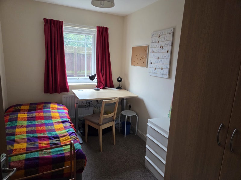 Bedroom: single bed, wardrobe space, small chest of drawers, desk space
