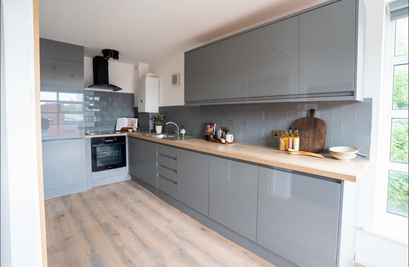 Modern Kitchen & Dining: Gorgeous open-plan layout with sleek grey gloss cabinets, natural wood countertops, and high-end appliances (including a massive double-door fridge/freezer). It also features a beautiful kitchen island/dining table with leather bar stools and a wall-mounted flat-screen TV—perfect for entertaining or relaxing.