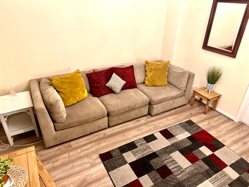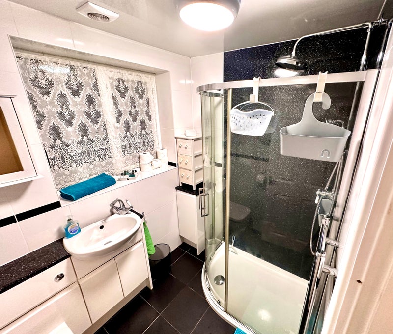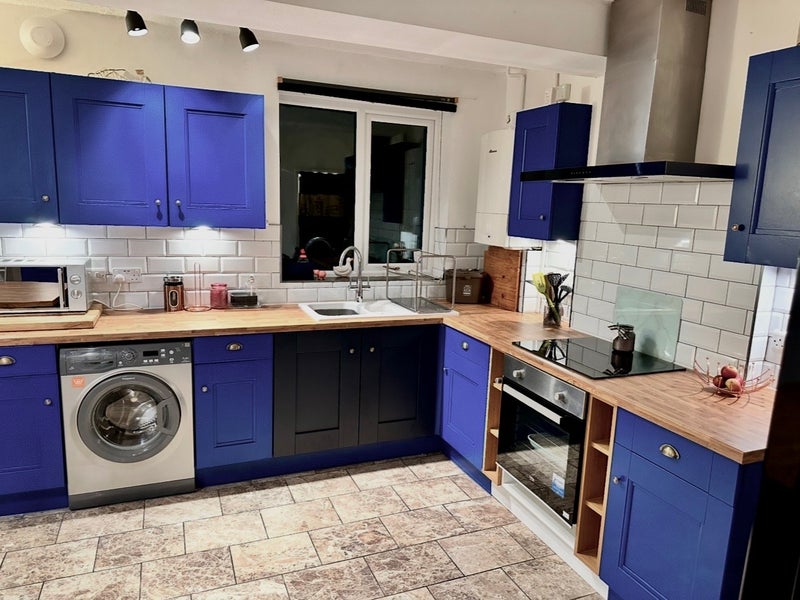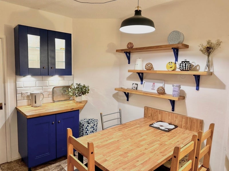 Large Kitchen-diner is multi-flexible & packed with wall/floor Units so easy to share. Large capacity washer, tall FF, m/w, toaster, kettle, iron & TWO vacs supplied. Dryer included if preferred.