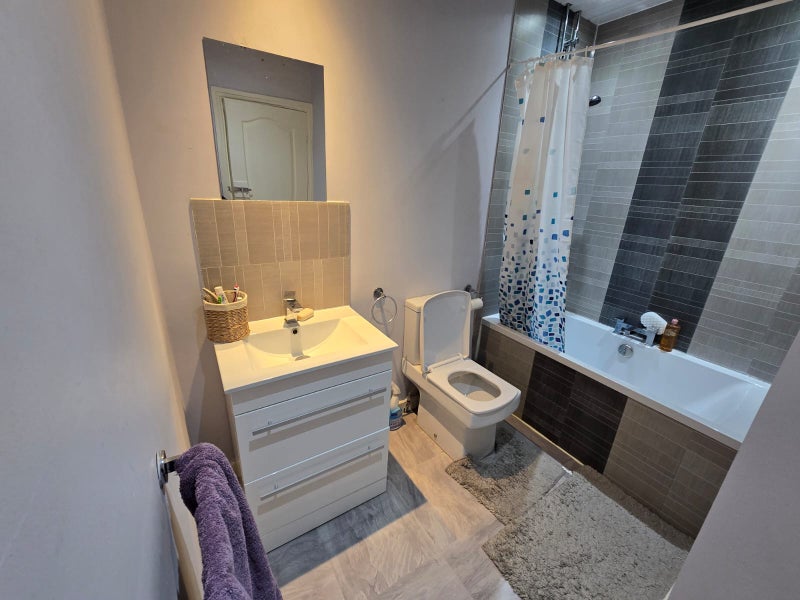 - Clean bathroom with shower over bath