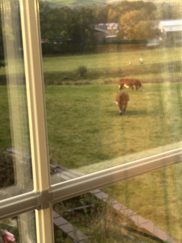 Lovely views from the room with sheep and cows right outside .