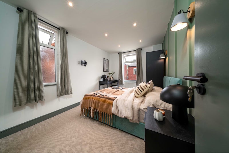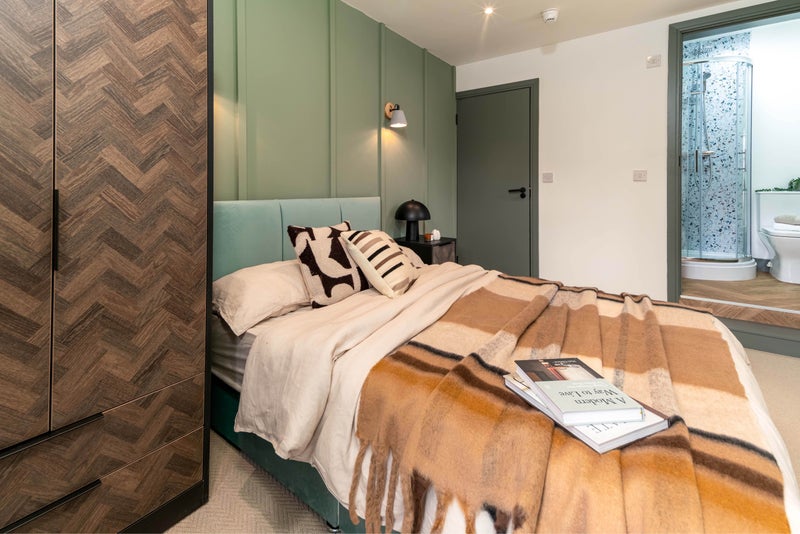 A stylish and comfortable ensuite double room, furnished with a double bed, wardrobe, desk, and bedside table - offering a great space to relax!