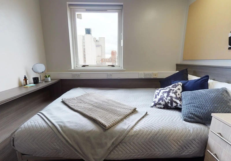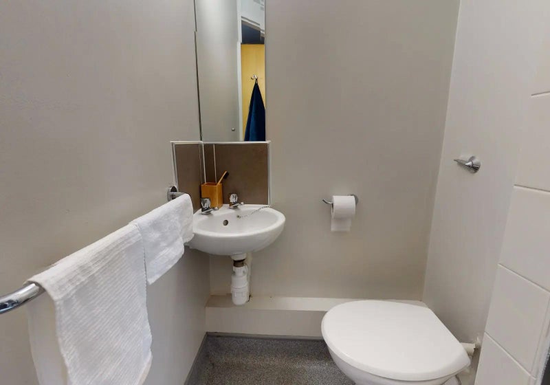 Room includes small double bed, study desk and chair, wardrobe, chest of drawers, mirror, shower, washbasin, toilet, high-speed WiFi.