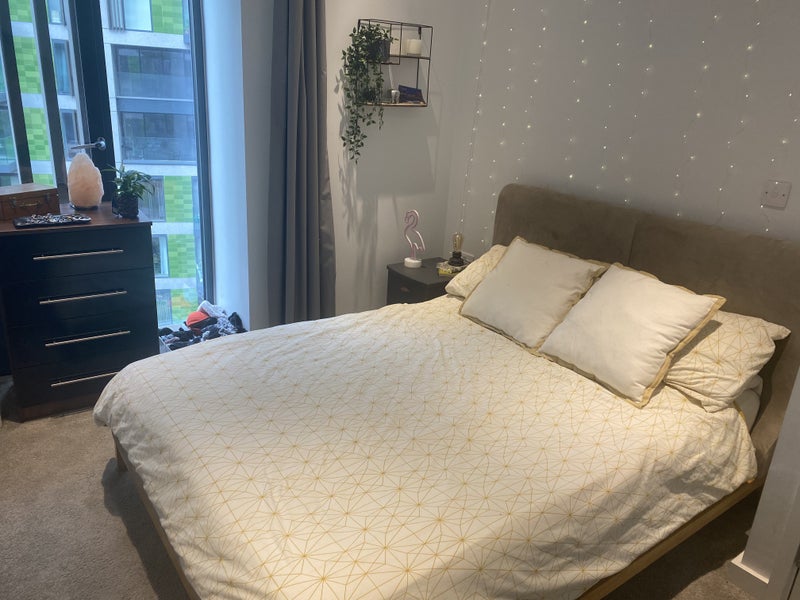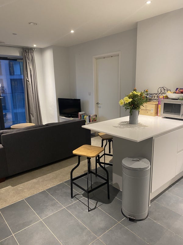 My current flatmate is moving out at the end of September therefore I have a double room containing a wardrobe, bedside table and chest of draws with an en-suite bathroom, containing a large shower with a waterfall head, sink and toilet and very large mirror. It is available from October 1st 2021. The flat itself has an open plan kitchen living space with 2 sofas and a tv stand, washing machine and dryer, a dishwasher and a kitchen island. There is also a balcony. The apartment complex is gated and made up of two buildings A & B. There is a gym, cinema room and a laundrette and open working space with free WiFi if you work from home and feel like you want to work in a different space.