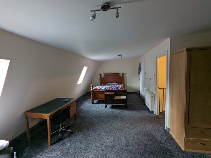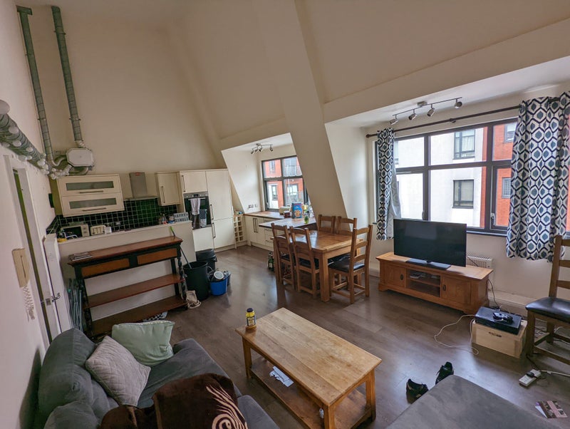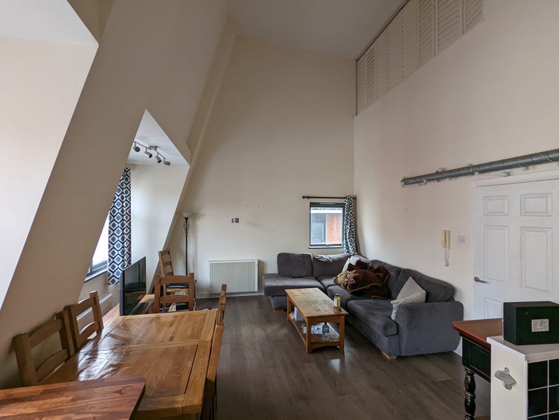 Lovely top floor flat, pictures do not do it justice! Part furnished duplex with 2 bedrooms, upstairs one with ensuite and a main bathroom with bath. Upstairs room considerably large and would suit a couple. There is a third room but it is an internal room, also with an ensuite and can be used as an office/study. Open plan living/kitchen area with high ceilings and lots of light. Includes a car parking space! Bills not included, currently has hyperoptic broadband.