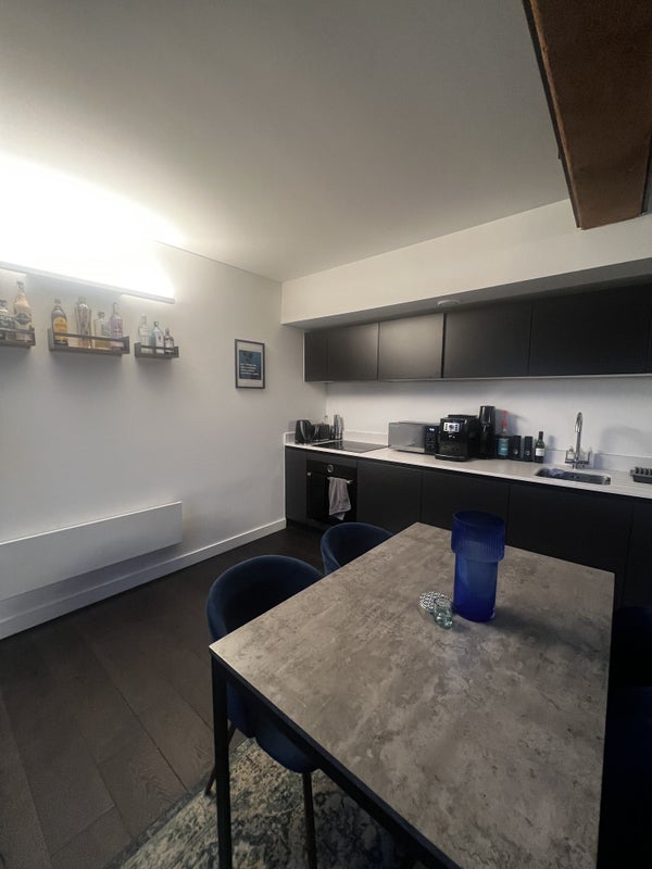 There is a utility room in the apartment with separate washer and dryer, concierge service is available 24/7 in the building and there’s a shared garden with BBQs and fire pits that we’re able to use all year round.