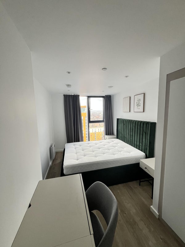 A bright double bedroom with a king-size bed, double wardrobe and a desk perfect for reading or working from home. The room is comfortable and well-furnished. Its non en-suite but there's a private bathroom.