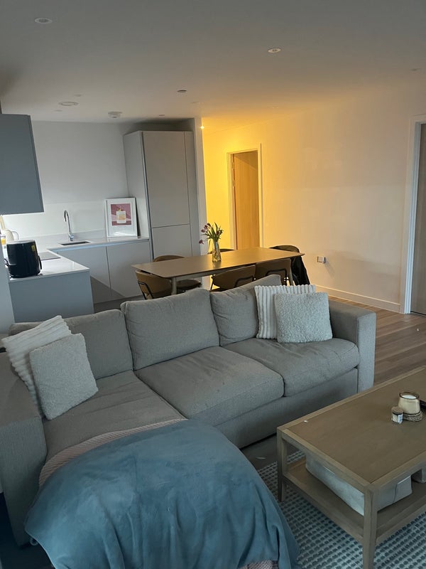 The apartment itself is bright, clean, and modern, with a spacious open plan living area, a fully equipped kitchen, and a balcony with great city views. We've also got fast free Wi-Fi, a washer/ dryer, and everything you'd expect in a new build.
