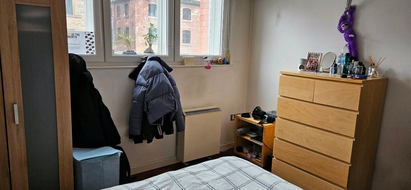 Furnished double room comes with double bed, wardrobe, chest of drawers and a bedside table. The flat is in a converted college building so there's loads of history within the walls. Exposed brick and large windows to let loads of sunlight in!