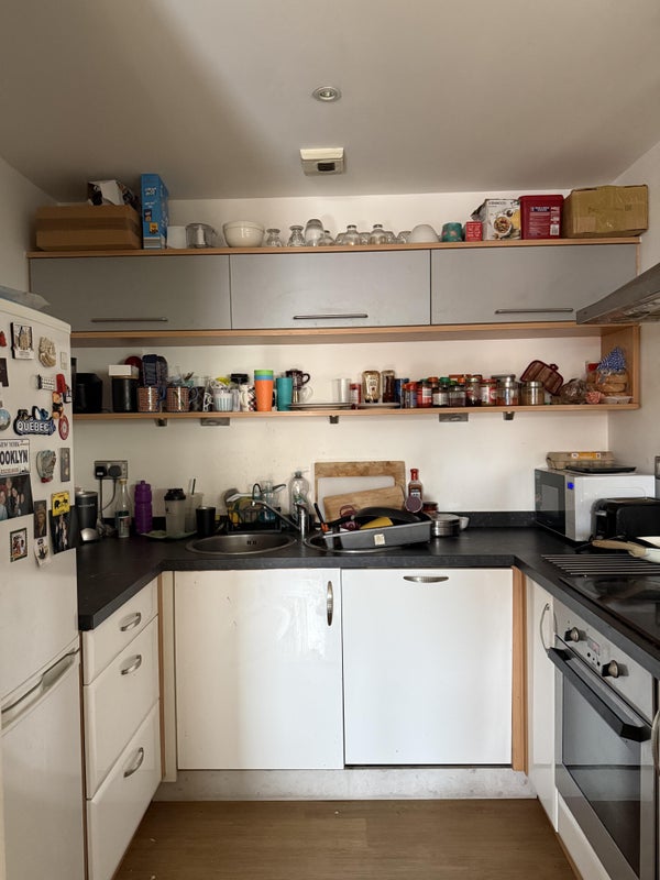 2. (shared) A large kitchen area with storage cupboards and shelves, fridge-freezer, hob, oven, microwave, dishwasher and sink/draining, as well as a separate glass storage unit.
