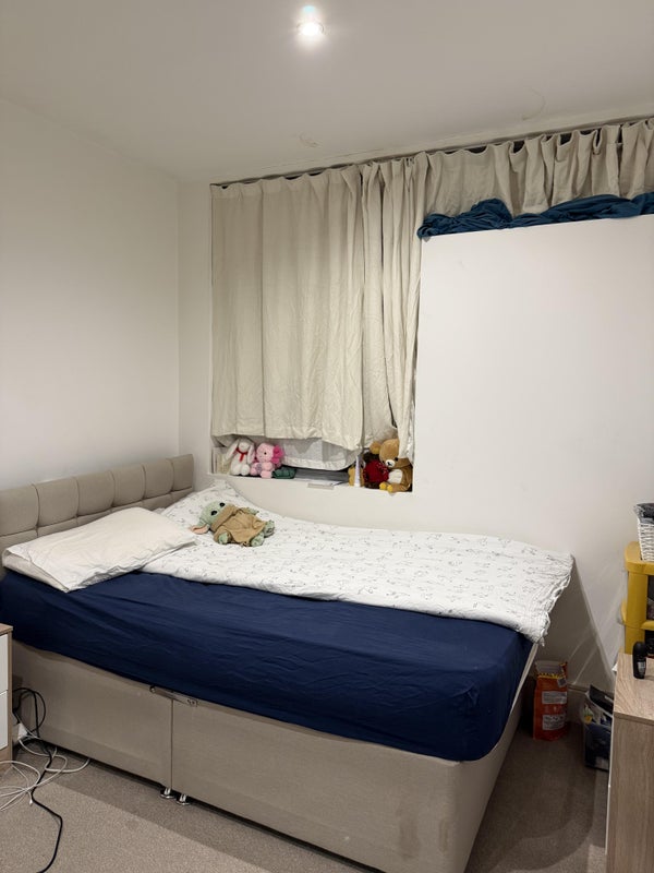 3. An inward-facing double bedroom. This consists of a double-bed with headboard, and a huge double-decker wardrobe with 2 compartments for coats/shirts/dresses, 5 shelves and a sliding shoe store, as well as 2 upper storage shelves. It also comes with a desk and desk chair, bedside drawer and storage drawers, as well as a NEW mattress (as of April 2026)